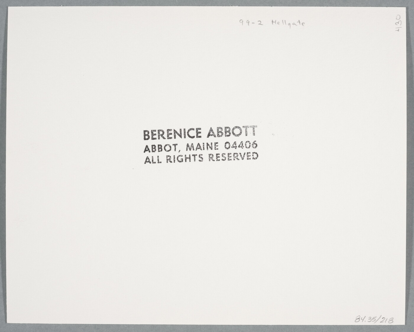 c. stamp: BERENICE ABBOTT \ ABBOT, MAINE 04406 \ ALL RIGHTS RESERVED