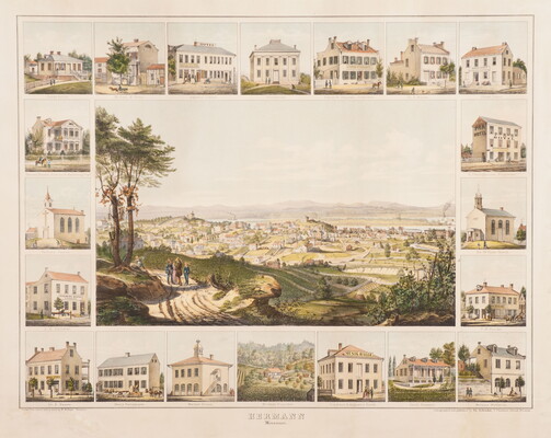 [20 Vignettes with descriptive key u.l. to u.r.:] James Arrott Michael M. Nolan. Augustus Leimer. Courthouse. Francis R. Rippstein, Proprietor. Ch. D. Eitzen. Joseph Doyon. \ Hermann Nursery, Husmann & Manwaring, Proprietors. R. Pfennighausen, Proprietor. \ Catholic Church. Ev. St. Pauls Church. \ J. G. Christel. P. W. Hincke \ Dr. A. Nasse. Henry Reitemeyer. Market House. Michael Poeschel. Constanz & Augustus Rieck. Jacob Rommel. Mathias Wuthrich.