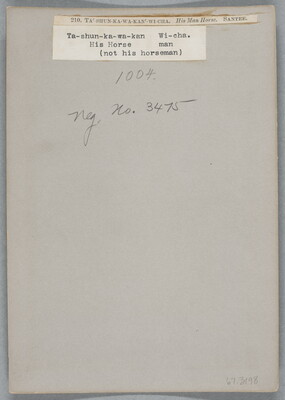 u.c. to u.r. printed on paper label: 210. TA-SHUN-KA-WA-KAN-WI-CHA. His Man Horse. SANTEE.