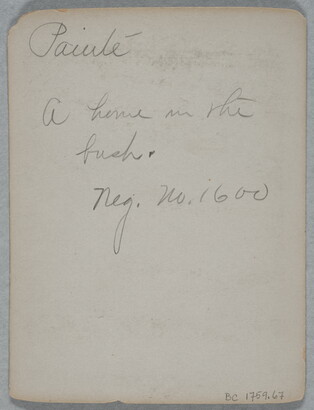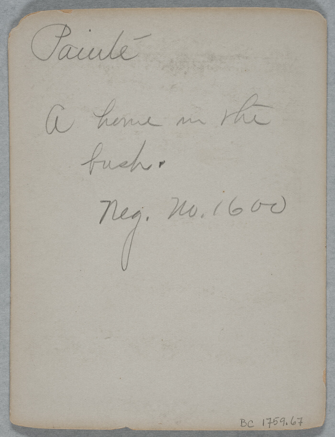 u.l. to c. in graphite: Paiute \ A home in the \ bush. \ Neg. No. 1600