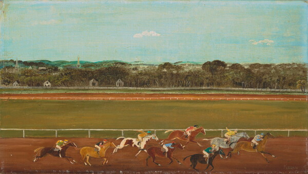 l.c. on printed label: "Horses at Fredericksburg" / Collection of / Dr. and Mrs. John McCutcheon, Jr. / Woodstock, Vermont / Mr. Kelly listed the names of the horses as / follows, from left to right: Gertie Bell, Rocky, / Blue Sue, Muletrain, Sandman, Little Nip, / Sky Up, Little Champ
