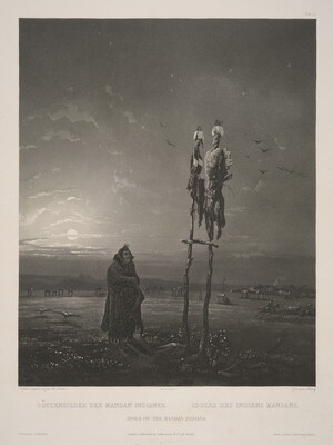 l.c.: Imp. de Bougeard \ GÖTZENBILDER DER MANDAN INDIANER IDOLES DES INDIENS MANDANS \ IDOLS OF THE MANDAN INDIANS \ London published by Ackermann & Co. 96 Strand \ [blind stamp] C. BODMER \ Direct