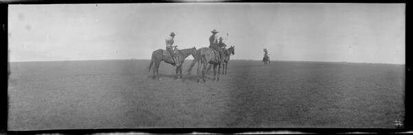 An indian giving the sign of peace to three mounted cowboys. Matador Ranch, Texas.