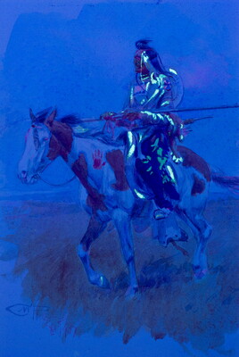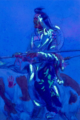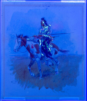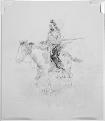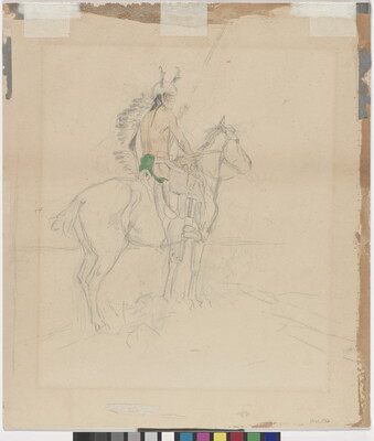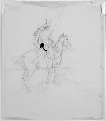 [graphite and transparent watercolor sketch of an Indian Brave on horseback]