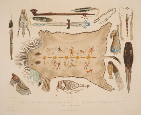 l.c.: Imp. de Bougeard. \ INDIANISCHE GERÄTHSCHAFTEN UND WAFFEN. USTENSILES ET ARMES INDIENS. \ INDIAN UTENSIL AND ARMS. \ London published by Ackermann & Co. 96 Strand. \ [blind stamp]