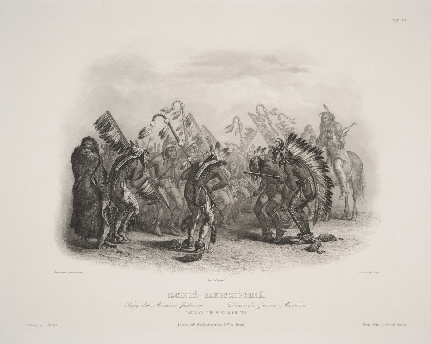 printed l.c.: Imp. de Bougeard \ ISCHOHA - KAKOSCHOCHATA. \ Tanz der Mandan Indianer. Danse des Indiens Mandans \ DANCE OF THE MANDAN INDIANS \ London, published by Ackermann & Co. 90, Strand \ [blind stamp]