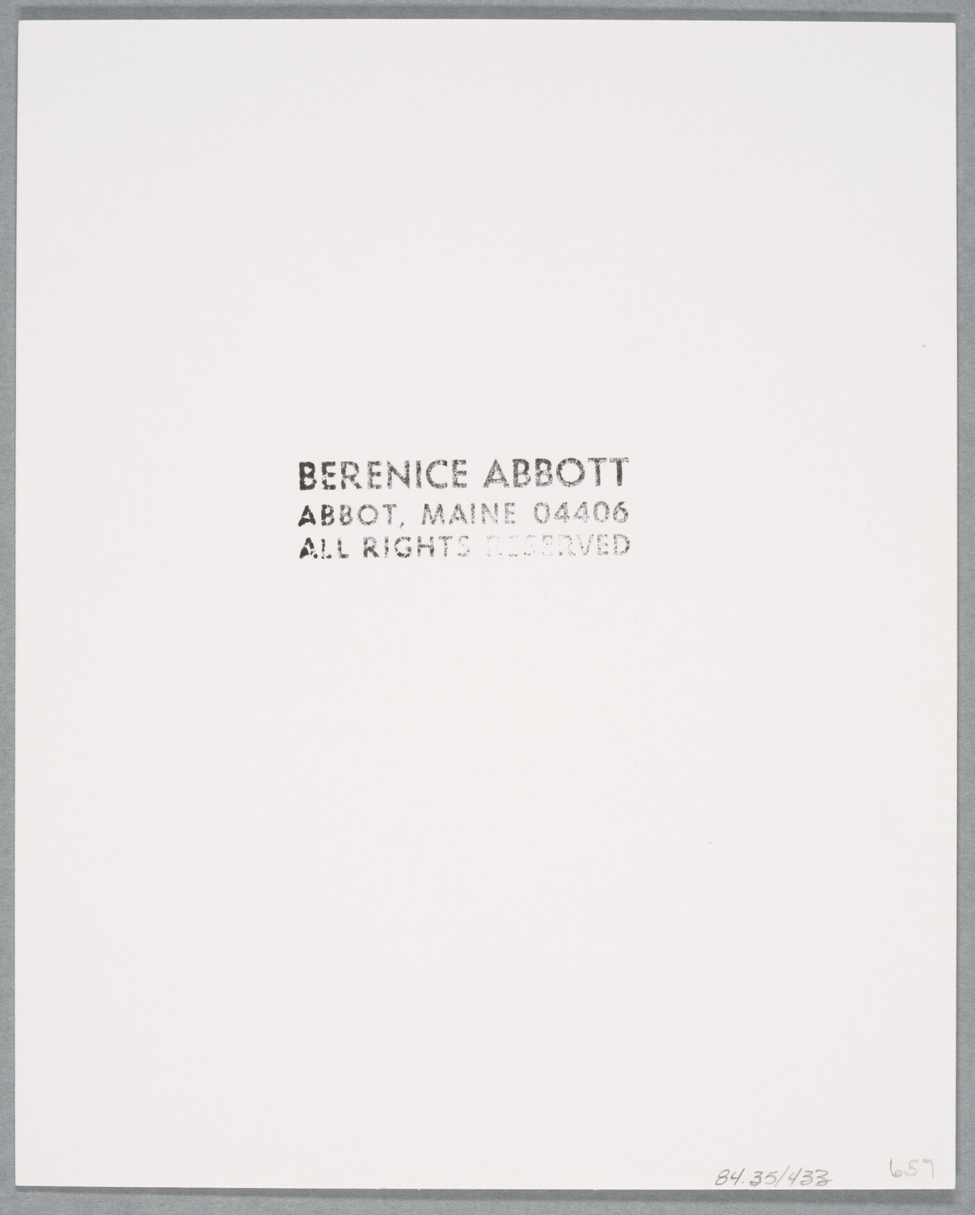 c. stamp: BERENICE ABBOTT \ ABBOT, MAINE 04406 \ ALL RIGHTS RESERVED