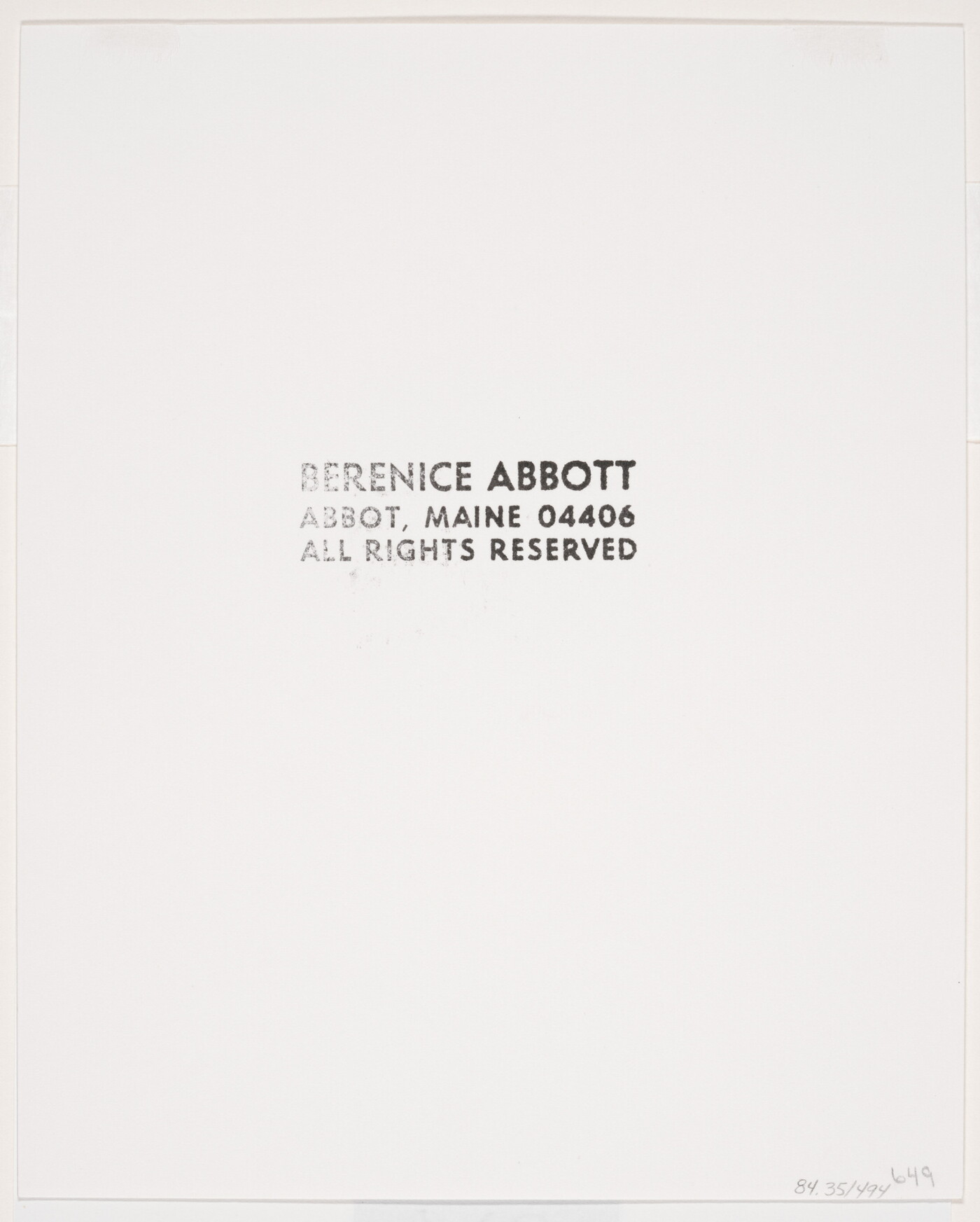 c. [stamp]: BERENICE ABBOTT \ ABBOT, MAINE 04406 \ ALL RIGHTS RESERVED