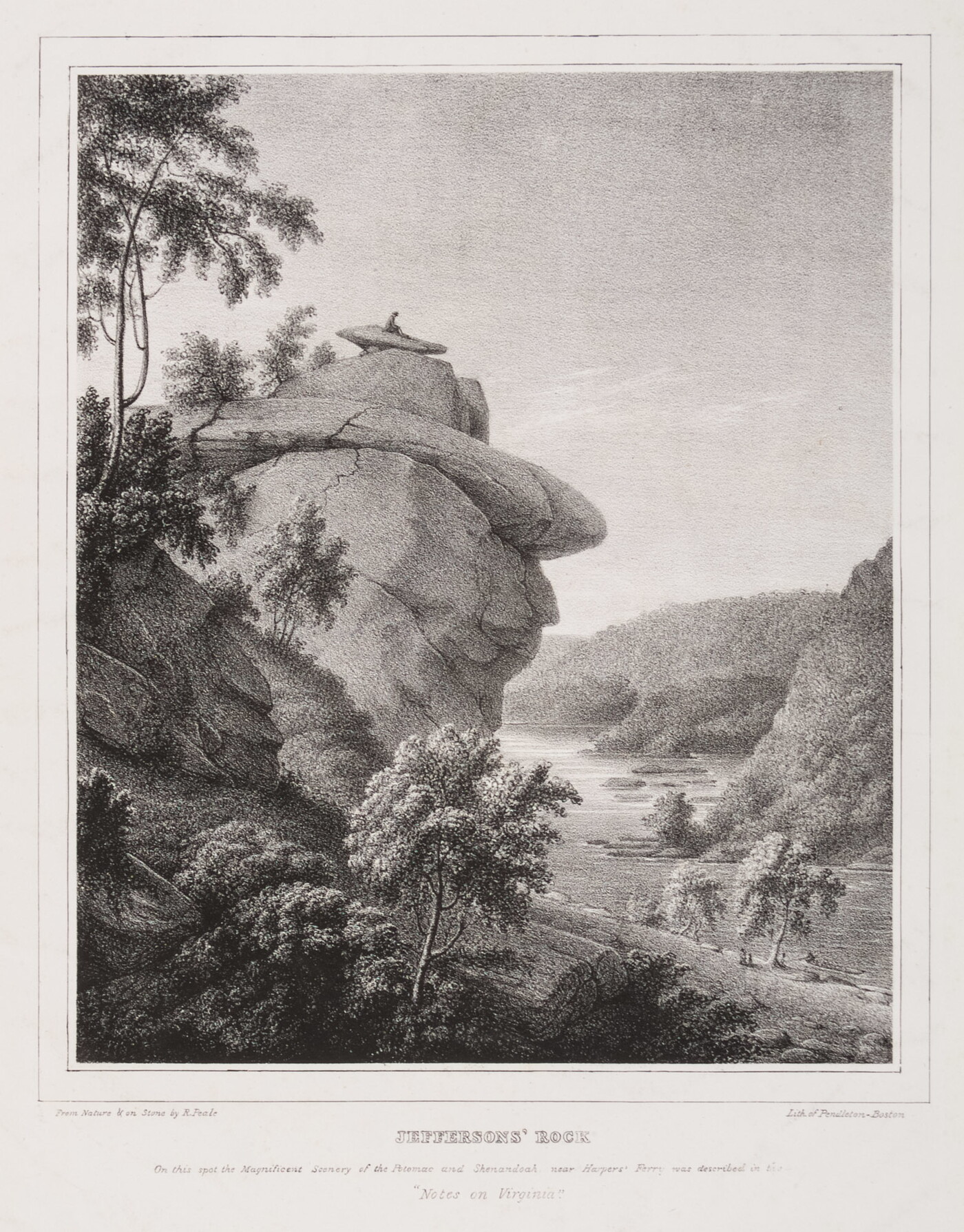 printed l.c.: JEFFERSONS' ROCK \ on this spot the Magnificent Scenery of the Potomac and Shenandoah near Harpers' Ferry was described in the \ "Notes on Virginia."