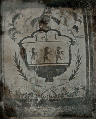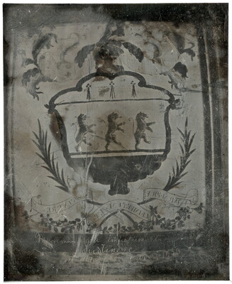 l.c. [scratched on plate]: Maximum praeli impetum et \ Sustinere \ Joel White's coat of arms 1650