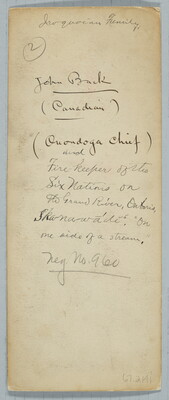 c. in ink: John Back [underlined] \ (Canadian) [underlined] \ (Onondaga Chief) \ and \ Fire-keeper of the \ Six Nations on \ The Grand River, Ontario, \ Ska-na-wadi, "On \ one side of a stream."