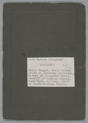 c. printed [on attached paper]: John Horton Slaughter \ 1841-1922 \ [in graphite] A97 \ 109 \ [printed] Texas Ranger, Trail Driver \ Scout in Geronimo Surrender, \ Father of Slaughter trail, \ Sheriff of Cochise County, \ Tombstone, Arizona, owner \ of San Bernardino Rancho.