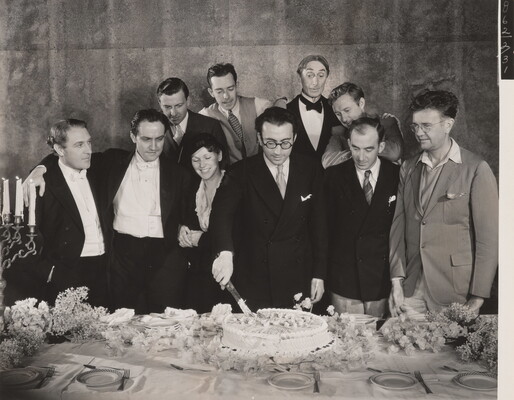 [Karl Struss with Rouben Mamoulian cutting cake with cast of "Dr. Jekyll and Mr. Hyde"]