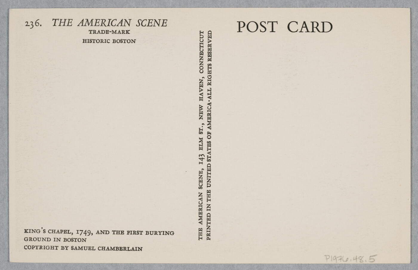 l.l. printed: KING'S CHAPEL. 1749, AND THE FIRST BURYING \ GROUND IN BOSTON \ COPYRIGHT BY SAMUEL CHAMBERLAIN