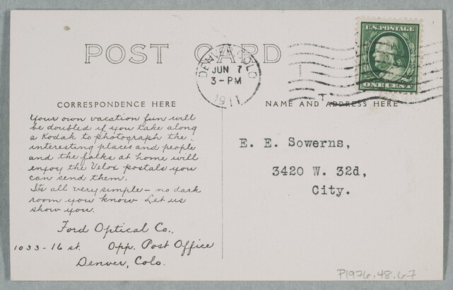 c.l. to l.c. printed: Your own vacation fun will \ be doubled if you take along \ a Kodak to photograph the \ interesting places and people \ and the folks at home will \ enjoy the Velox postals you \ can send them. \ Its all very simple - no dark \ room you know Let us \ show you. \ Ford Optical Co., \ 1033-16 st. Opp. Post Office \ Denver, Colo.