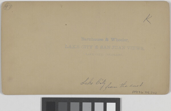 c. [stamp]: Barnhouse & Wheeler, \ LAKE CITY & SAN JUAN VIEWS, \ LAKE CITY, COLORADO.