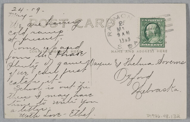 u.l. to l.c. in ink: 24 - 09- \ May- \ We are having \ cold rains \ at present. \ Come up and \ fair thechase \ pleanty of game \ if we can just \ catch it \ School is out Fri. \ then I may have \ time to write you \ a letter. \ With Love - Ethel.