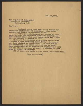 Laura Gilpin, Colorado Springs, Colorado, to Register of Copyrights. October 26, 1939.