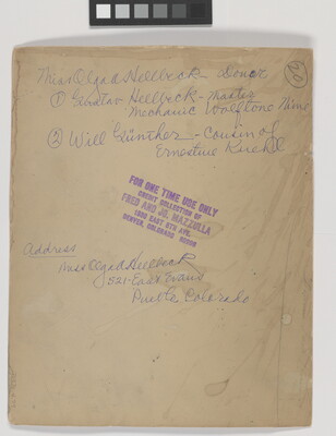 u.l. to u.r. in blue ink: Miss Olgaa Hellbeck - Donor \ 1 [circled] Gustav Hellbeck - Master \ Mechanic Wolftone Nime \ 2 [circled] Will Gunther - Cousin of \ Ernestine Kuehl