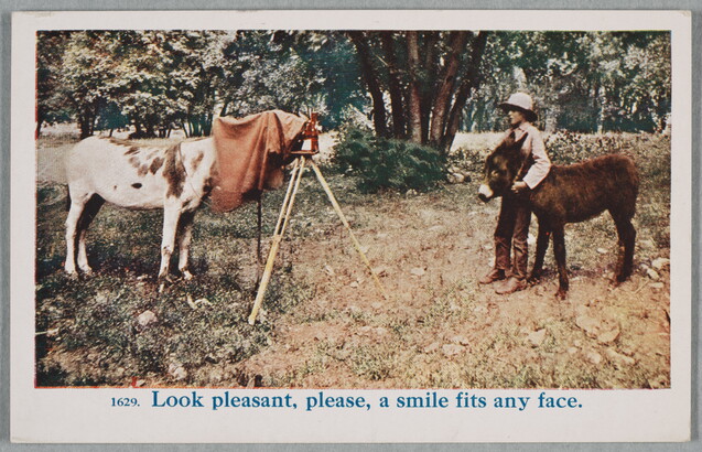 l.l. to l.r. printed in blue, below image: 1629. Look pleasant, please, a smile fits any face.