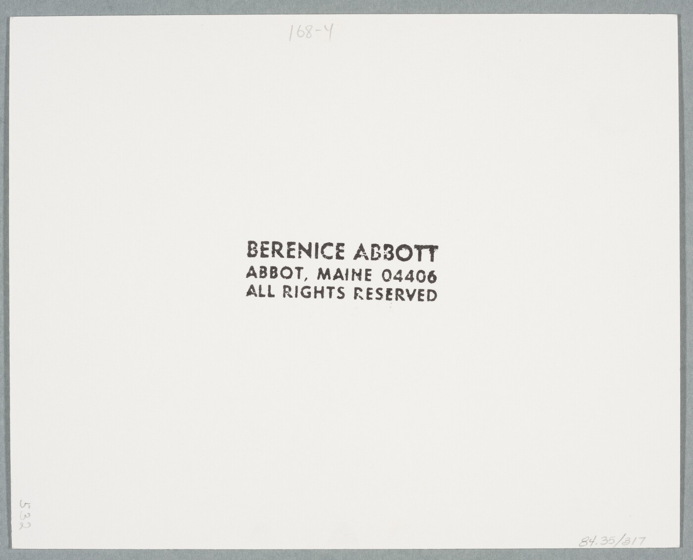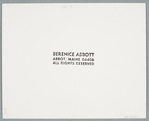 c. [stamp]: BERENICE ABBOTT \ ABBOT, MAINE 04406 \ ALL RIGHTS RESERVED