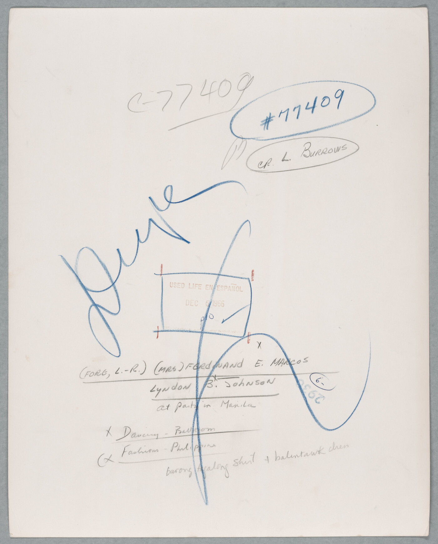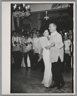 l.c. in graphite: (FORE, L.-R.) (MRS) FERdiNAND E. MARCOS / Lyndon B. Johnson / at party in Manila / x Dancing - Ballroom / x Fashion - Philippine / barong tagalog shirt + balintawk dress