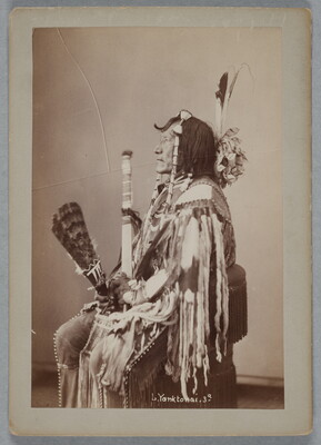 u.c. to c. in graphite: buried near Standing Rock. N.D. \ Was a supporter of Sitting Bull and \ supplied him with ammunition and flour \ The Yanktonai's were surrounded by \ the 7th Cav. - in 1876 and surrendered \ 2000 head of horses all their guns and \ were left in winter at their camp \ on the Missouri River \ this chief made the surrender \ Neg. 3537-8