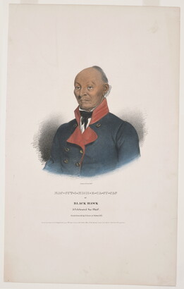 l.c.: Lehman & Duval Lith[rs]. \ MAC-CUT-I-MISH-E-CA-CU-CAC \ or \ BLACK HAWK \ A Celebrated Sac Chief. \ Painted from life by J.O. Lewis at Detroit 1833. \ Entered according to act of Congress in the year