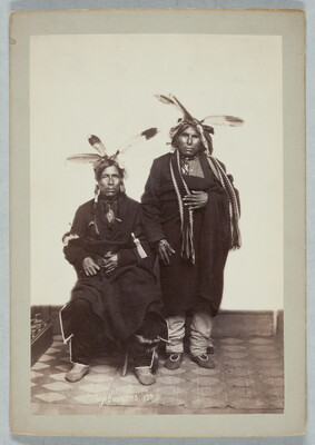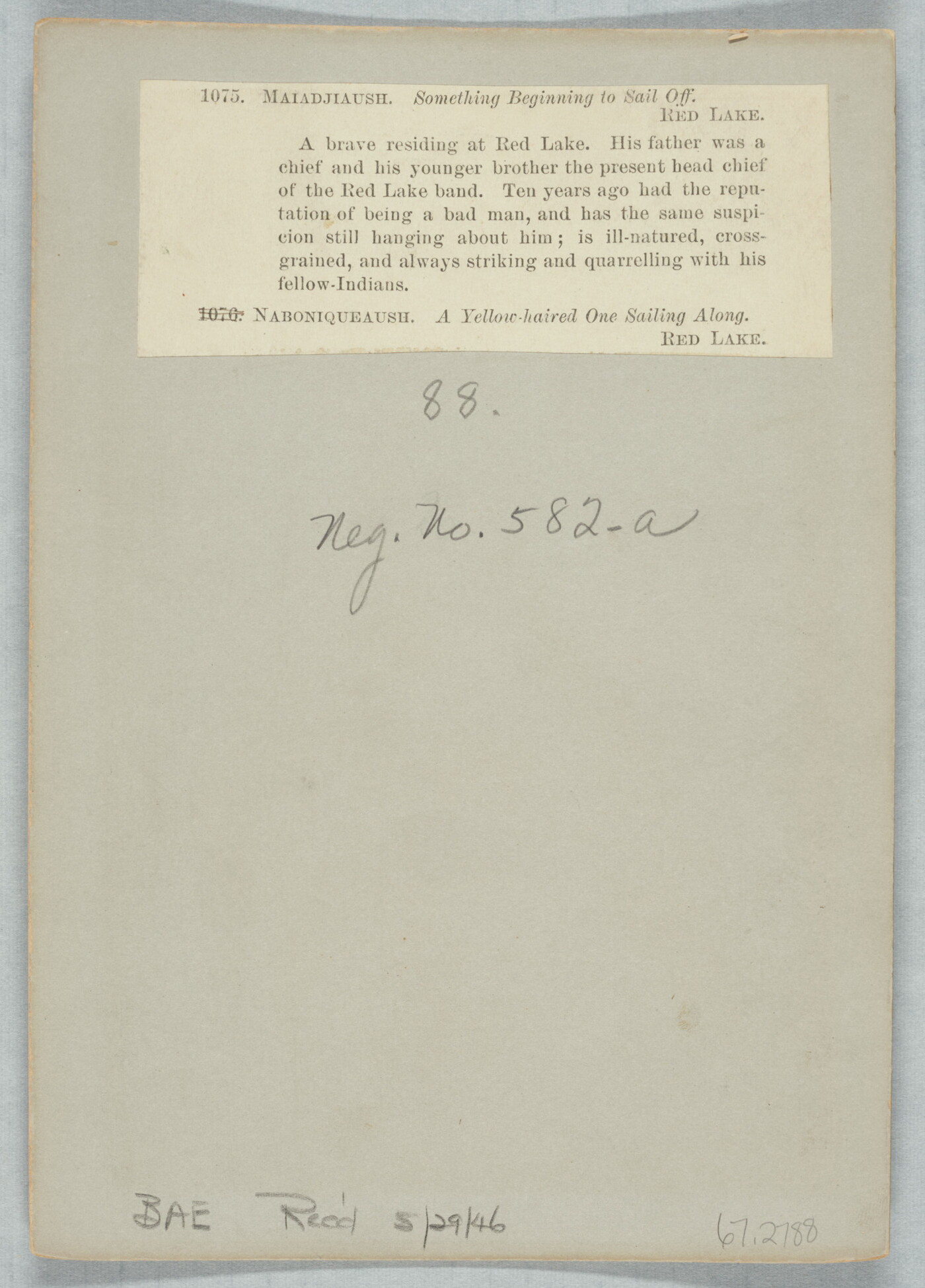 u.l. to u.r. printed on paper label: 1075. MAIADJIAUSH. Something Beginning to Sail Off. \ RED LAKE. \ A brave residing at Red Lake. His father was a \ chief and his younger brother the present head chief \ of the Red Lake band. Ten years ago had the repu- \ tation of being a bad man, and has the same suspi- \ cion still hanging about him; is ill-natured, cross- \ grained, and always striking and quarrelling with his \ fellow-Indians. \ 1076. [crossed out] NABONIQUEAUSH. A Yellow-haired One Sailing Along. \ RED LAKE.