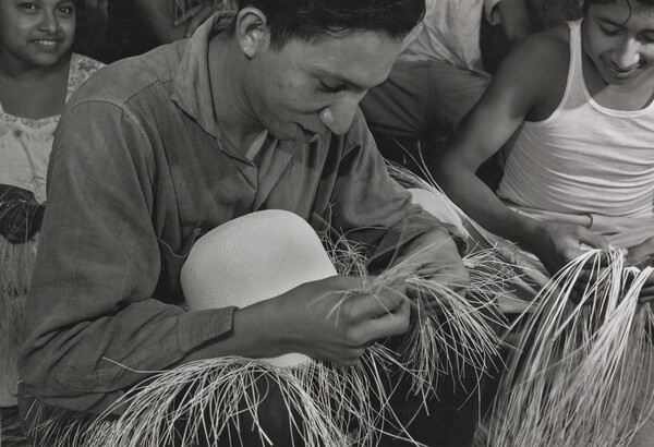 u.c. on paper label: [printed]: PHOTOGRAPHS \ BY LAURA GILPIN \ BOX 1173, [crossed out in ink] SANTA FE, NEW MEXICO \ [typed]: Making Panama Hats. Yucatan