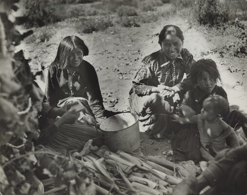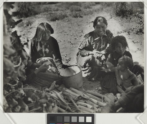 u.l. in ink: bucket contains com mixture \ for tamales, which are pile \ on a sheepskin until ready for \ roast-baking in open fire.