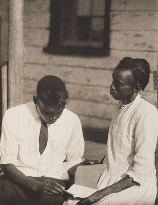 [Man and woman reading outdoors]