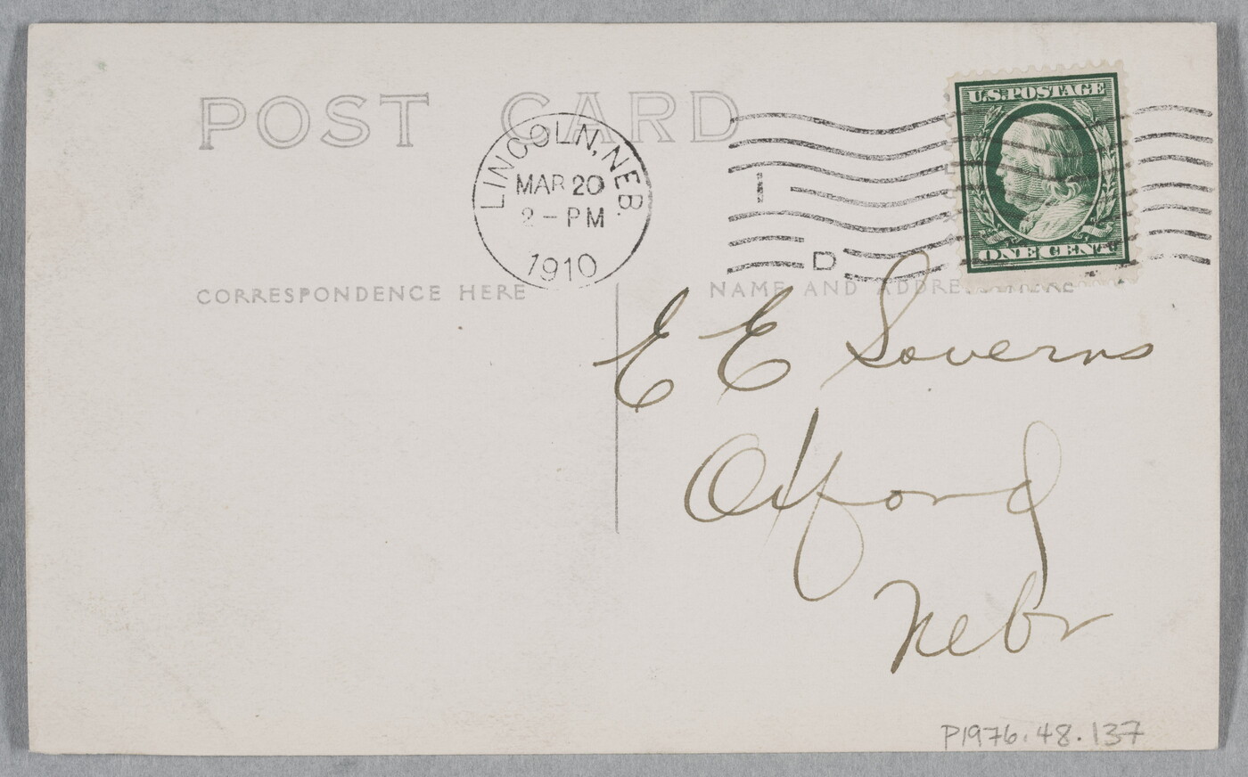 u.c. stamped in black ink: Lincoln, Neb. \ Mar 20 \ 2 - PM \ 1910
