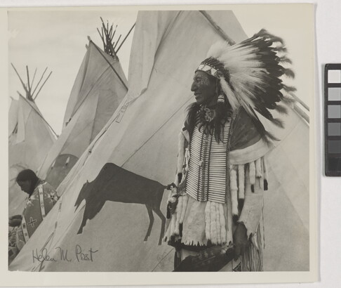 [Man in ceremonial dress in front of tipis]
