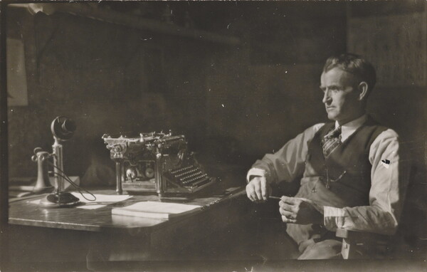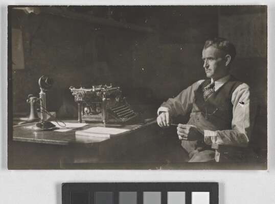[Man at desk with typewriter and telephone, Creede, Colorado]