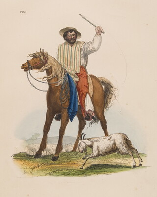 [Man on horseback, whipping a goat]