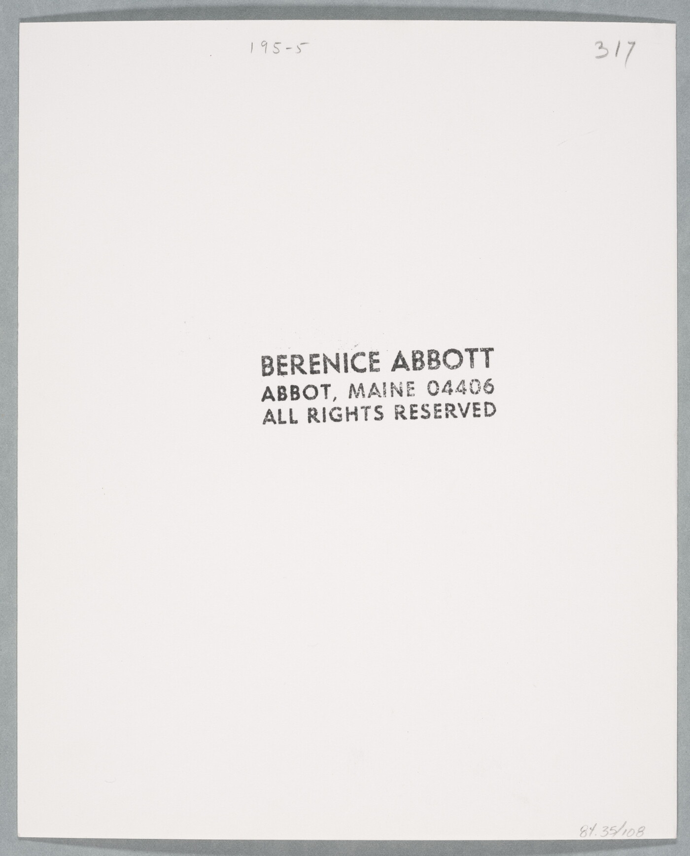 c. [stamp]: BERENICE ABBOTT \ ABBOT MAINE04406 \ ALL RIGHTS RESERVED
