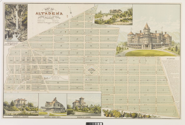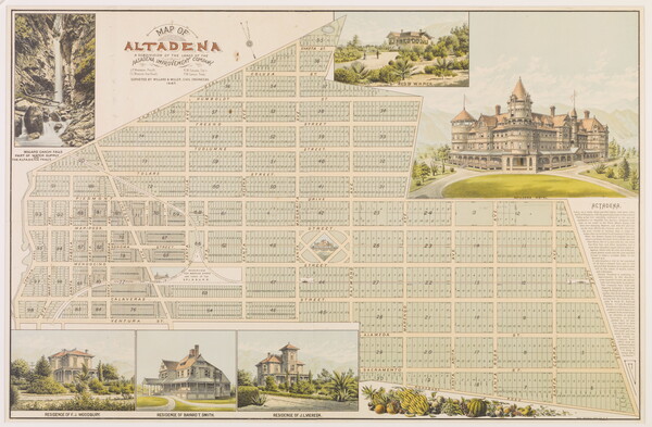u.l.: MAP OF \ ALTADENA \ A SUBDIVISION OF THE LANDS OF THE \ PASEDENA IMPROVEMENT COMPANY. \ J.P. WOODBURY, Pres'dt. R.M. FURLONG, Sec'y. \ E.C. WEBSTER, Vice Pres'dt. P.M. GREEN, Tres's. \ SURVEYED BY WILLARD & MILLER, CIVIL ENGINEERS. \ 1887.