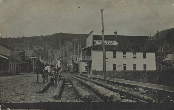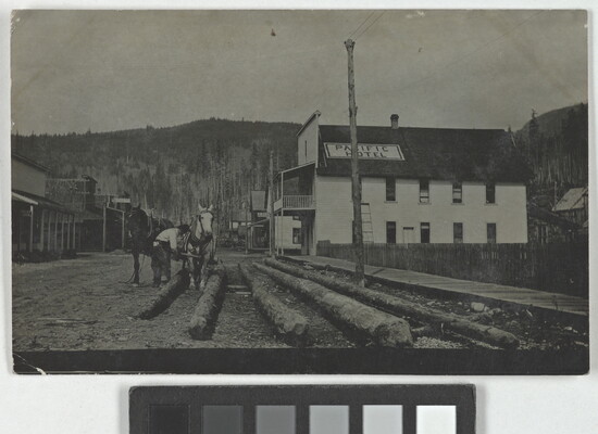 u.l. to l.c. in ink: Main Street \ Looking North. \ Top of hill 1 mile away. \ Bean Poles, cut in \ gulch at night just back \ of Pacific Hotel \ Length of poles 110 and 120 ft \ To be shipped by sail to \ Bellingham \ Lowell C Bell