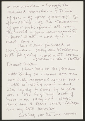 Autograph document signed. Says Margaretta knows Dorr is not completely recovered yet, because she has spoken with Barby and tells how eager she is too see Dorr on May 23rd when she and Anne will leave Smith College where they have been for Margaretta’s 25th Reunion.
