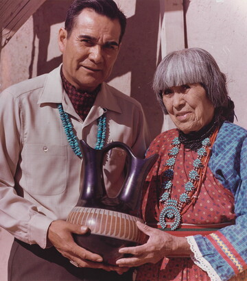 [Maria Martinez and Popovi Da holding pottery jar]