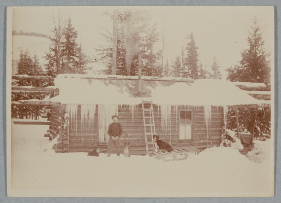 [Martin W. Trester in front of snow-covered cabin]