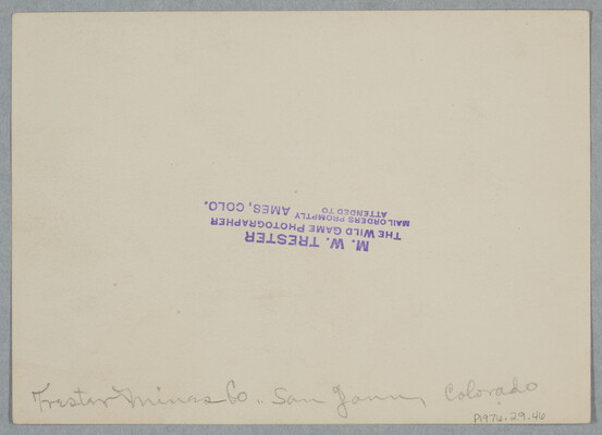 c. [stamp] [upside down]: M.W. TRESTER \ THE WILD GAME PHOTOGRAPHER \ MAIL ORDERS PROMPTLY \ ATTENDED TO \ AMES, COLO.