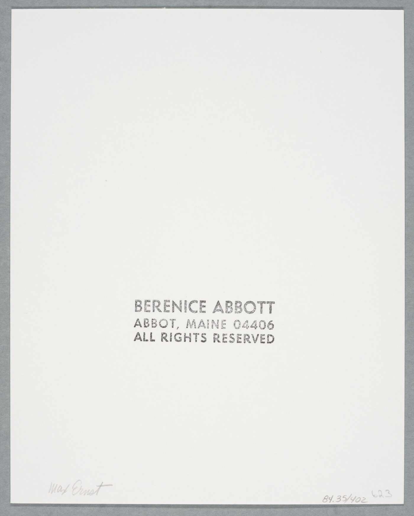 c. stamp: BERENICE ABBOTT \ ABBOT, MAINE 04406 \ ALL RIGHTS RESERVED
