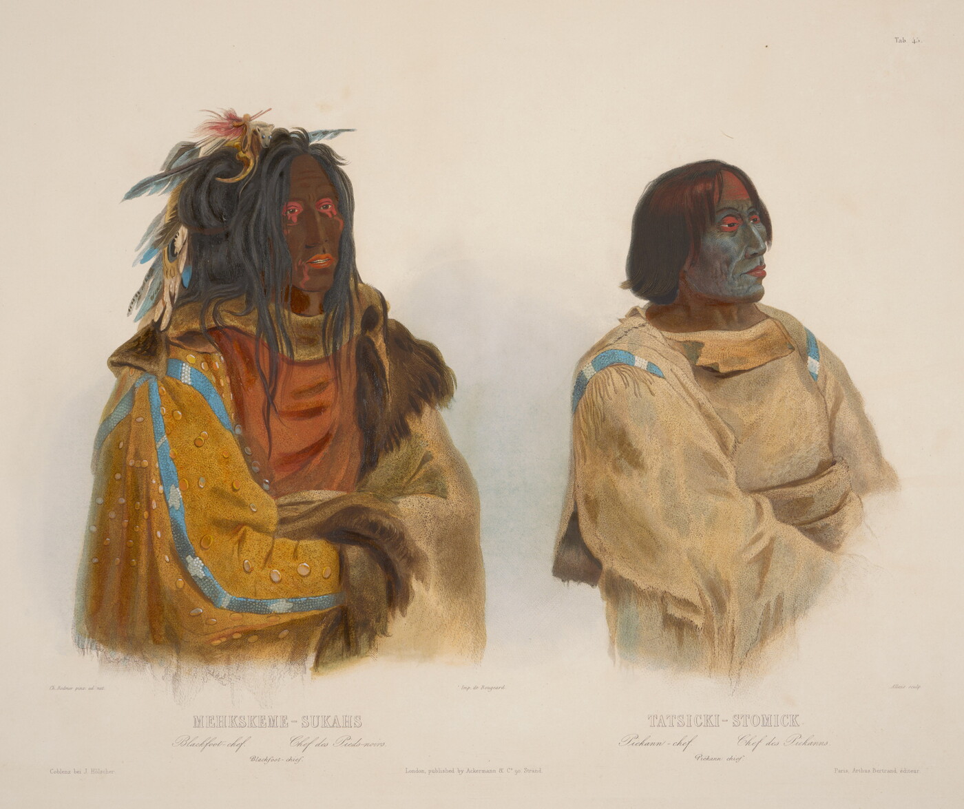 l.c.: Imp. de Bougeard \ MEHKSKEME-SUKAHS TATSICKI-STOMIK \ Blackfoot-chef Chef des Pieds-noirs Piekann-chef Chef des Piekanns \ Piekann chief \ Blackfoot- chief.London, published by Ackermann & Co. 90 Strand \ [blind stamp]
