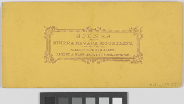 c. printed: SCENES \ IN THE \ SIERRA NEVADA MOUNTAINS, \ ILLUSTRATED FOR THE \ STEREOSCOPE AND ALBUM. \ ALFRED A. HART, Artist, 135 J Street, Sacremento.