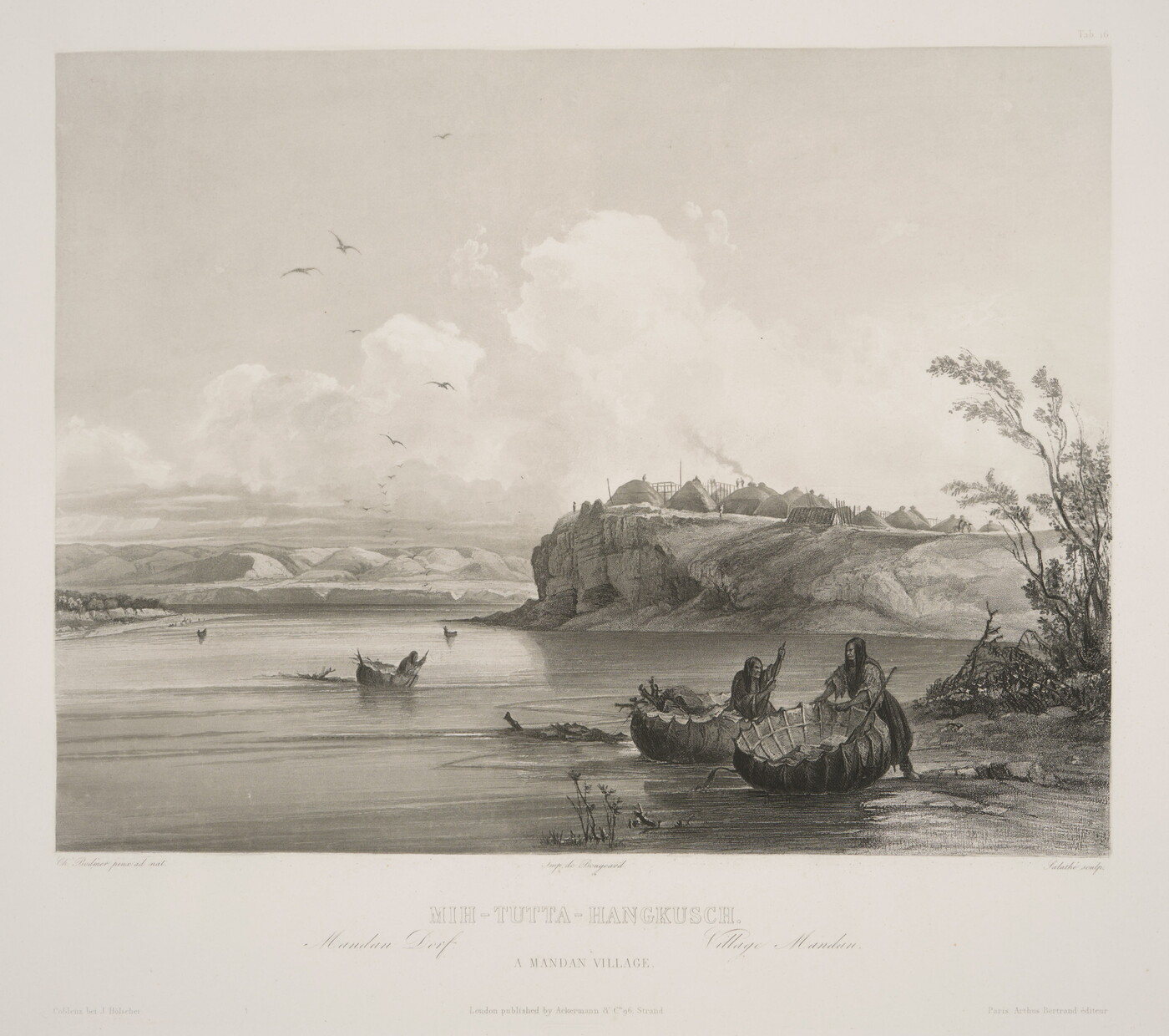l.c.: Imp. de Bougeard \ MIH-TUTTA-HANGKUSCH \ Mandan Dorf. Village Mandan \ A MANDAN VILLAGE. \ London published by Ackermann & Co. 96. Strand. \ [blind stamp] C. BODMER \ Direct