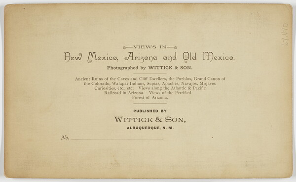 c. printed: Views In \ New Mexico, Arizona & Old Mexico, \ Photographed by Ben. Wittick. \ Ancient ruins of Caves and Cliff Dwellers,the Pueblos, Grand Canon \ of the Colorado, Walapai Indian, Supais, Apaches, Navajos, \ Mojaves, Curiosities, etc., etc. Views along the \ Atlantic & Pacific Railroad in Arizona. \ Published by \ BEN. WITTICK, \ Albuquerque, N.M.