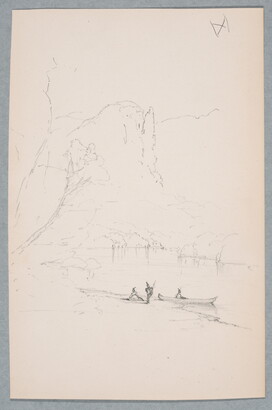 Mountain Outcropping and Lake with Three Native American Figures
