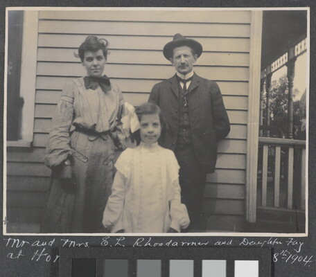 l.l. to l.r. in ink: Mr. and Mrs. E.L. Rhoadarmer and Daughter Fay \ at Home Milan Ills. June 28th 1904.
